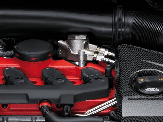 A low pressure fuel pump (LPFP) in the fuel tank delivers fuel to the high pressure fuel pump (HPFP) at roughly 4 to 6 bar. Fuel pressure is then bumped up to a maximum of 145 bar, depending on factory parts, with the HPFP. Finally, high pressure fuel is delivered to the injectors, which spray directly into the cylinders.