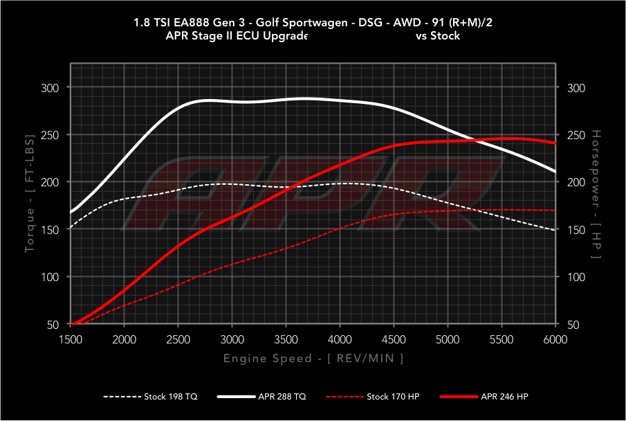 | 91 AKI / 95 RON | 246 HP | 288 FT-LBS | +75 HP | +93 FT-LBS |