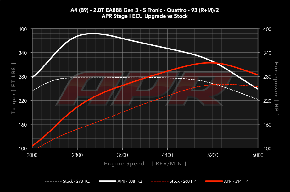 APR's ECU Upgrades are the best dollar-per-horsepower modification one can make to improve engine performance. The upgrades dramatically increase horsepower and torque, making for an exceptionally quicker and more exciting vehicle. This is made possible through APR's optimization of the factory engine management system to take full advantage of the engine's capabilities, without needing any end user adjustment. The ECU Upgrades are available with various features and supported octane levels and each stage is compatible with most typical bolt-on modifications. The software is installed to the vehicle's factory ECU through the OBD-II port, resulting in a clean and headache-free install. Furthermore, for those looking for tuning with a limited powertrain warranty, APR Plus has you covered!