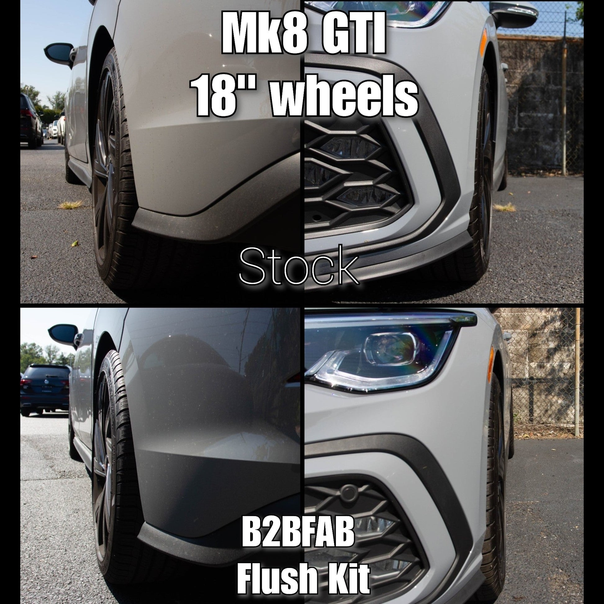 Our B2BFAB Flush Plus spacer kit is comprised of our very own precision machined 15mm front and 20mm rear wheel spacers. This combination was selected to space your wheels out even with the muscular Mk8 body lines. If you're looking to give your GTI the perfect stance, look no further. This is the kit for you!
