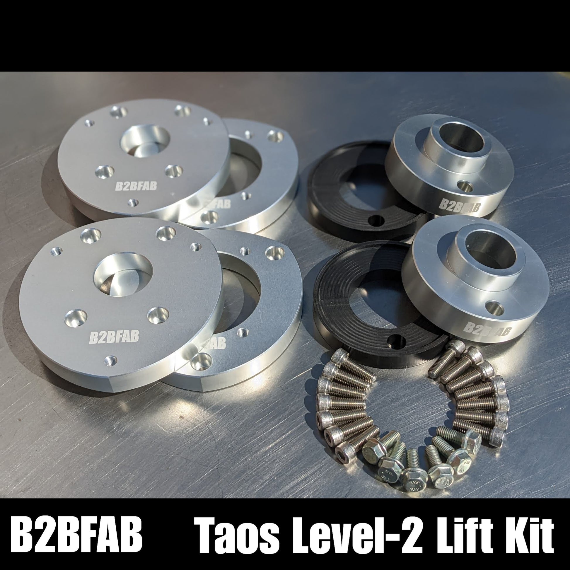 The B2BFAB Level-2 Camber Correcting Lift Kit is the only kit on the market for your Taos that provides the 1.5" lift you want without sacrificing handling, ride quality, or proper alignment specifications!