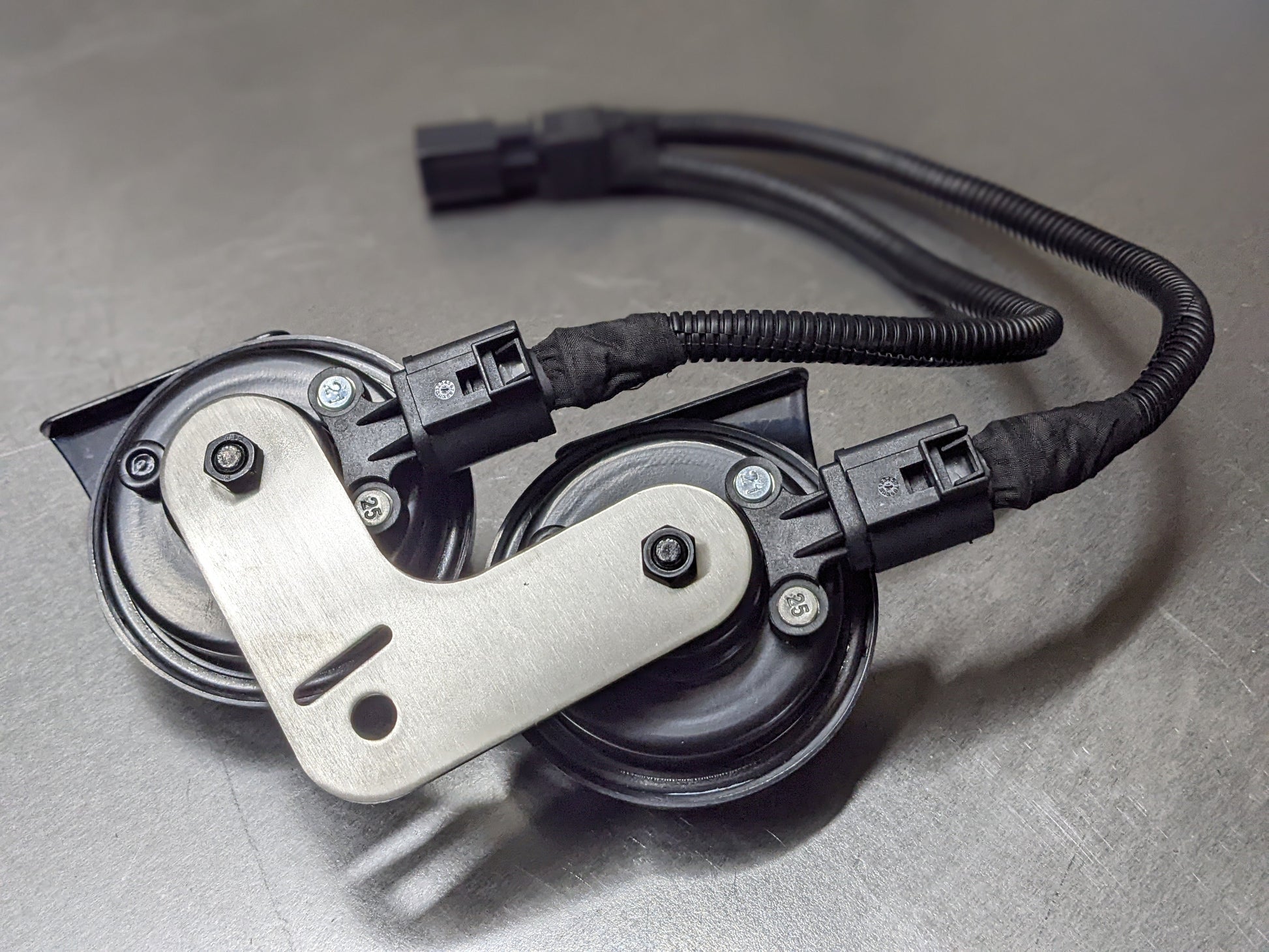 We developed a dual tone horn kit with plug and play wiring harness that mounts via a precision CNC cut stainless steel bracket for long life and optimal corrosion resistance. The entire assembly slips right into place and installs with just one bolt in the factory location. Install is easy with only having to remove the screws along the top of the upper grill to gain access. Get your B2BFAB Taos Upgraded Dual Tone Horn Kit and enjoy the power of a horn that alerts pedestrians, follow motorist, and demands respect rather than laughter.