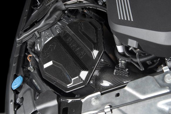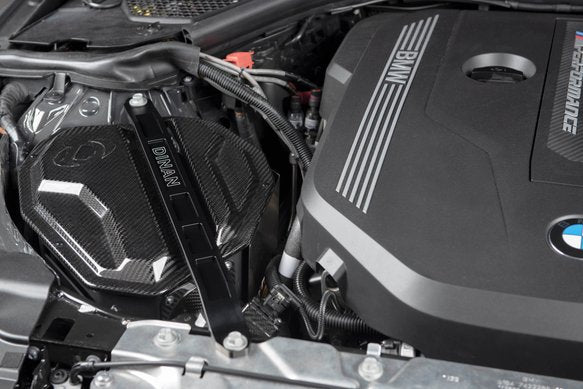 The M240i/M340i/M440i are impressive vehicles in terms of performance and style but that is not conveyed when viewing its lackluster stock intake system swaddled by seemingly unfinished strut braces. In stock trim, the M240i/M340i/M440i comes with a dry and lifeless air box housing a basic panel filter that is also accompanied by an intake resonator whose job it is to eliminate turbo/intake noises. The same noises that those in the performance world relish. Essentially BMW has seen fit to give M240i/M340i/M440i owners an air box that looks uninspiring, flows adequately but not ideally, and emits no noise. The exact opposite of what the platform exudes otherwise. The Dinan carbon fiber intake for the platform rights these wrongs and delivers a semi-open intake capable of flowing 58% more air than the stock system resulting in additional top end power and increased throttle response. At the same time revealing a more aggressive, sporty carbon fiber appearance, and an increase in sound courtesy of the removal of the intake resonator and implementation of a semi-open design.