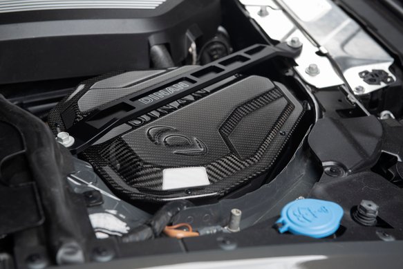 With more air being pulled into the system, throttle response is improved and additional power is realized in the form of max gains of +9 WHP / +8 ft-lbs of torque. The secondary air inlets also allow the intake system to be more audible so the turbo spool and BOV can be appreciated. A stark difference from Dinan's traditional fully sealed systems where induction noise is not nearly as recognizable. Not to be outdone by the increased power and sound, the outwardly visible system is made of immaculate carbon fiber so the under the hood appeal is vastly improved over its drab and utilitarian beginnings. A worthy piece to add to an already impressive vehicle.