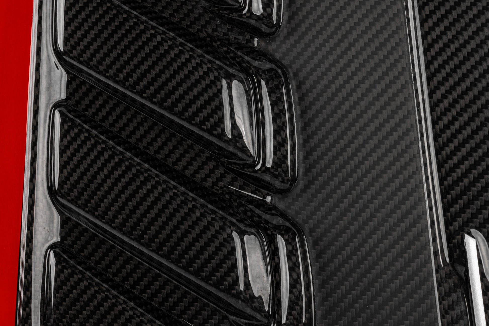 Our carbon fiber engine cover is drop dead gorgeous. It's a mixture of premium matte carbon fiber, mixed with gloss carbon fiber to give a two tone look that's down right exotic. The overall profile matches the spirt of the factory Lamborghini cover to give it an OEM+ look that doesn't appear gaudy or out of place. White highlights down the sides and a red stripe down the middle give it an extra pop that's sure to turn heads, and the world renowned APR logo plate lets everyone know it's a premium upgrade. The cover looks great with the factory intake, but really shines with the APR Carbon Fiber Intake System. Simply plug and play this upgrade with minimal effort.