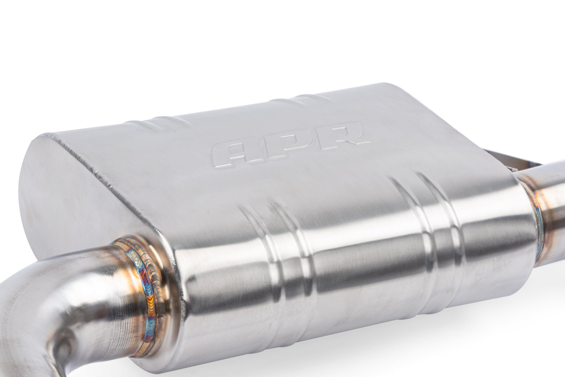 The APR Catback Exhaust System personalizes your vehicle's looks, sound and performance. Beautifully hand-crafted T304-stainless-steel components adorn the system with stunning TIG-welding throughout. Our straight-through brushed-finished mufflers smooth the exhaust note to a deep growl, without adding restrictions or rasp. Our center Helmholtz resonator cuts through drone so you only hear the sounds that are pleasing to the ear. Strong high-quality bracketry and OEM-style clamps hold the system steadily in place, making the install or removal a snap, and fitment simple, yet precise. A cast 3" to dual 2.5" rear splitter creates an ultra-smooth transition, steadily feeding exhaust gasses out of the system, while looking tidy from under the rear bumper. Finally, removable 4" polished slash-cut exhaust tips finish the system, adding a classy motorsport-inspired touch to the rear of the vehicle.