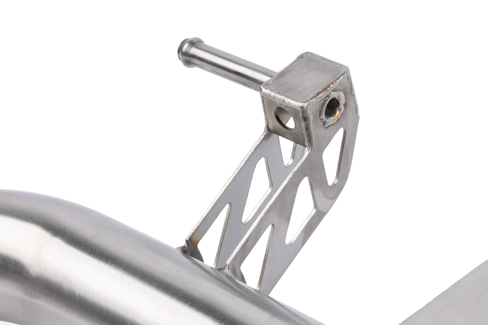 - Single 3" (76mm) to dual 2.5" (63.5mm) mandrel-bent brushed tubing