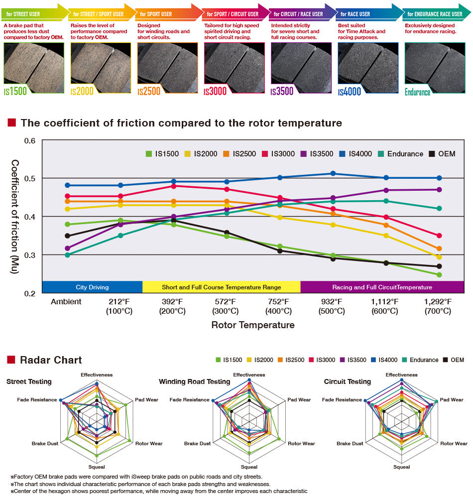 We have everything, from super-clean IS1500 street, all the way to Endurance race compound! All made in Japan backed with iSWEEP quality. iSWEEP street pads also feature a provision for brake wear sensor, no bypass is needed.