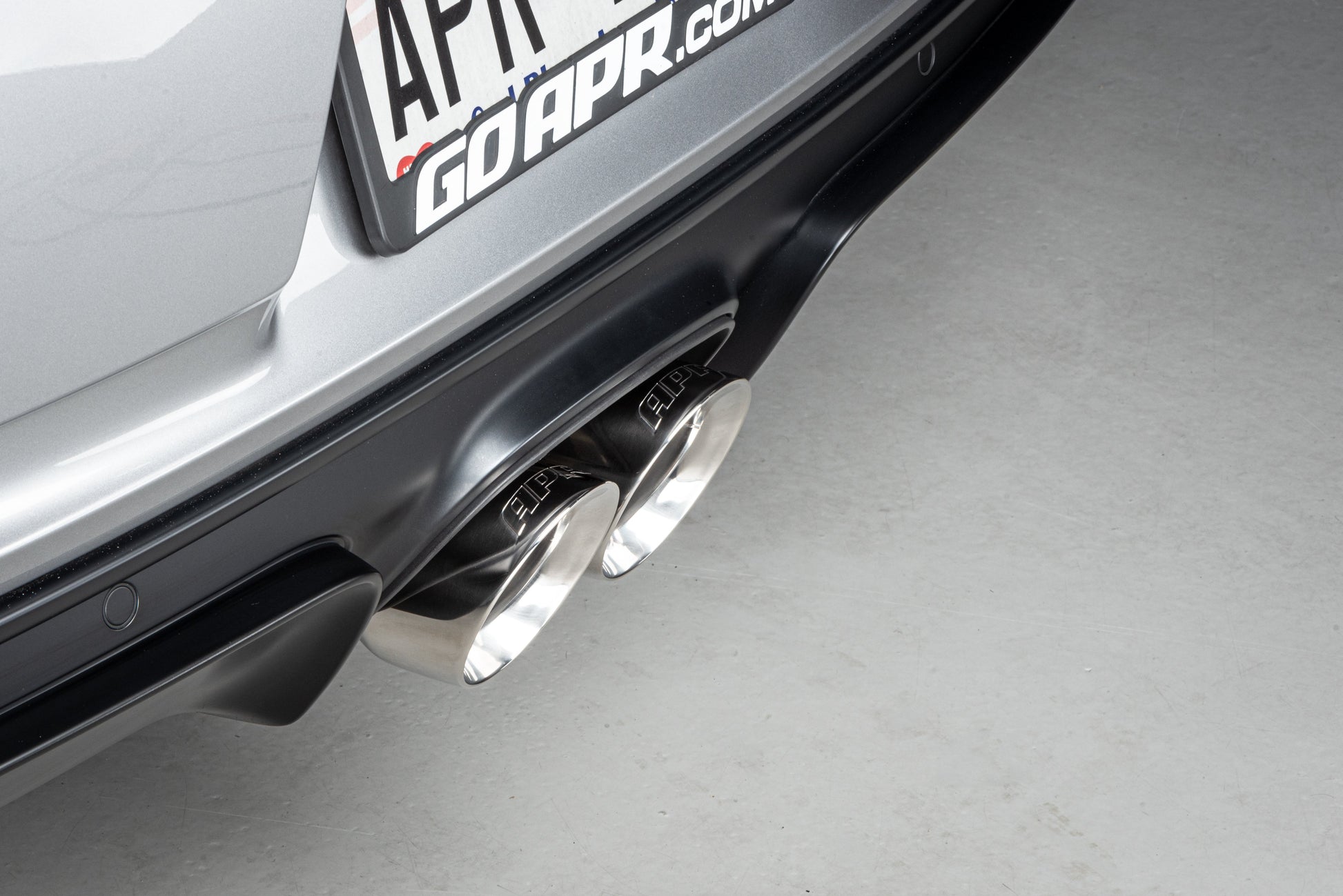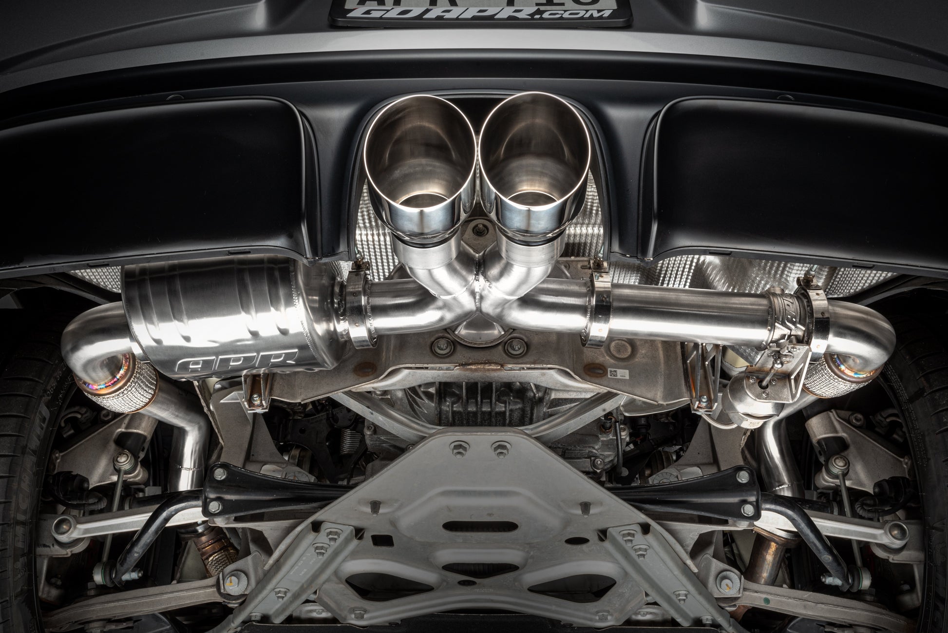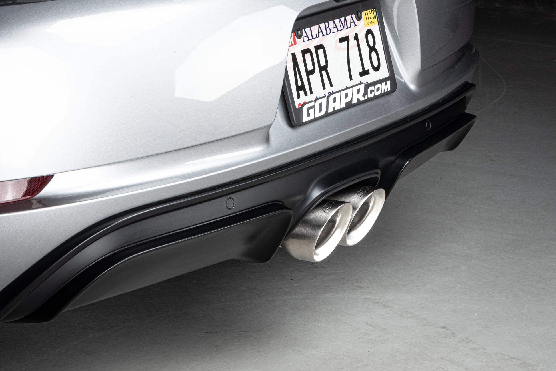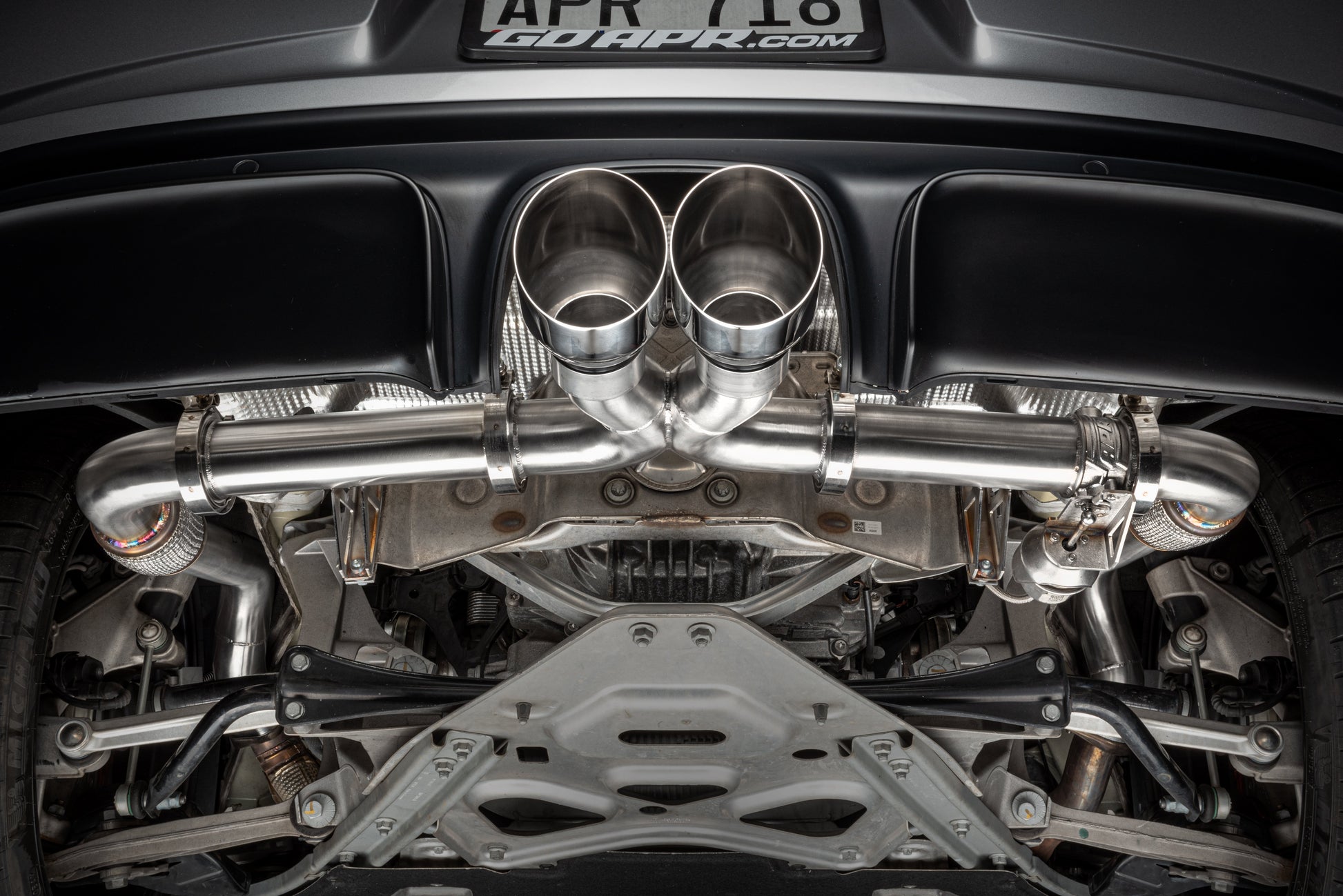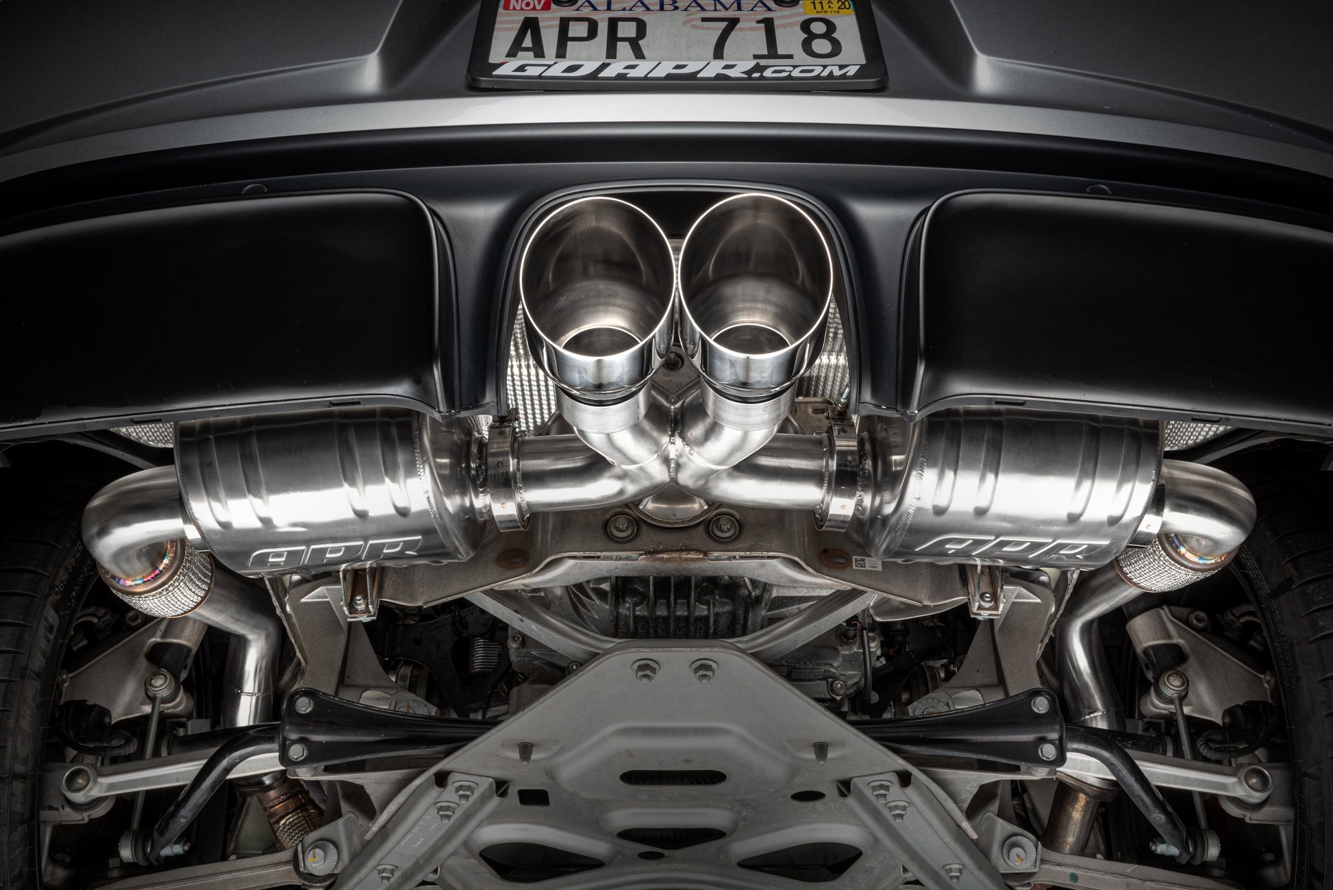 In stock form, the 718 is quiet, even with the Porsche Sport Exhaust (PSE), but the APR system wakes up the vehicle and gives the turbocharged boxer engine the sound profile it deserves. Expect a deep boxer growl that will turn heads and enhance the driving experience. Track enthusiasts will actually be able to hear their exhaust as they blow past the competition. The system has many optional tips so you can customize the looks to your desire. It supports both valved and non-valved factory setups, and has options for adding one or two mufflers to accommodate everyone's needs on and off the track!