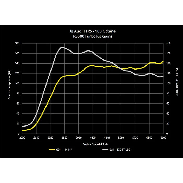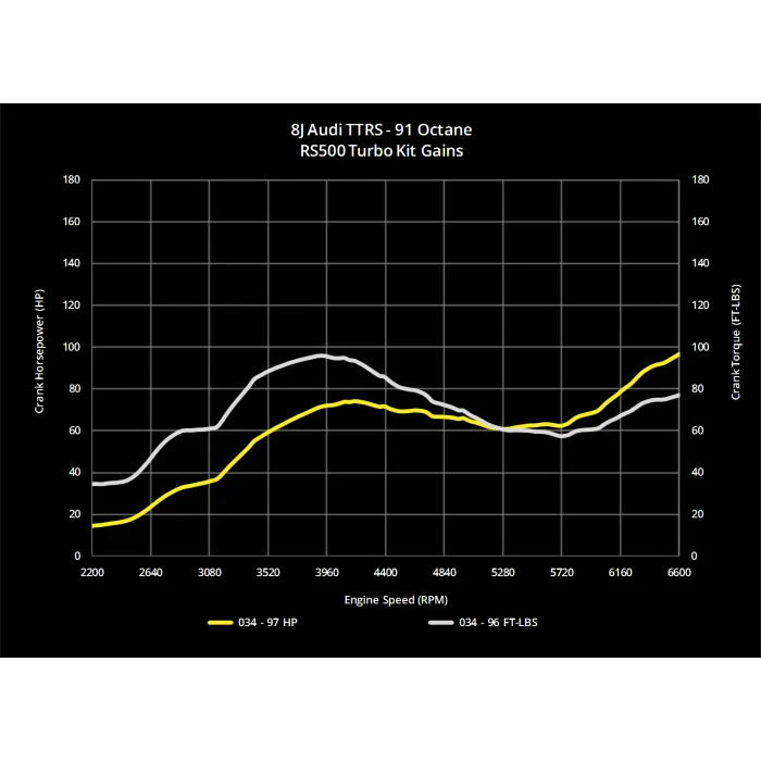 RS500 was designed for the track day enthusiast who desires an improved usable powerband without sacrificing reliability. Providing significant increases in horsepower and torque past 5,000 RPM, the RS500 Tuning Package shines on track where the factory turbocharger drops off at higher RPM's. Consisting of an OEM+ turbocharger upgrade, higher-flow high-pressure fuel pump, and 034Motorsport’s proprietary performance software, the RS500 tuning package is the elegant, reliable solution for breathtaking performance on the street or track, at an excellent price point.